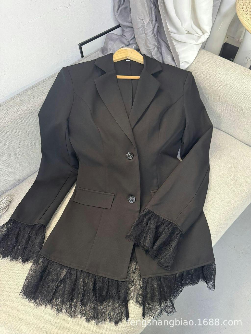 - Classico con un Tocco Diverso – Blazer sartoriale con fondo e polsi rifiniti in pizzo floreale.